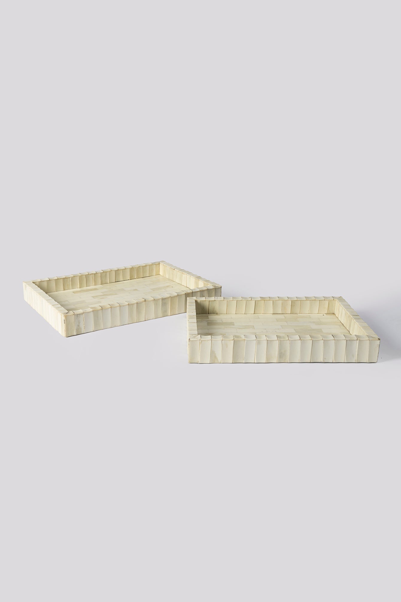 The Wooden Bone Inlay Tray Set includes two beautifully crafted trays. Adorned with intricate bone inlay work, these trays are both stylish and practical, making them a delightful addition to your home decor.